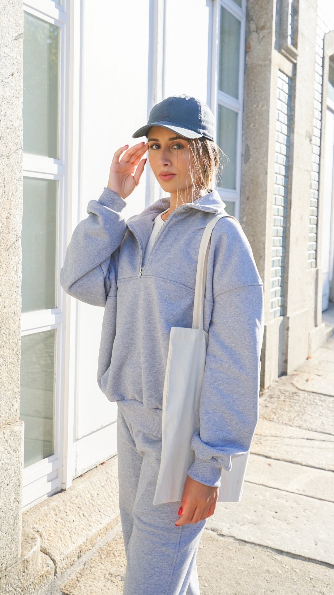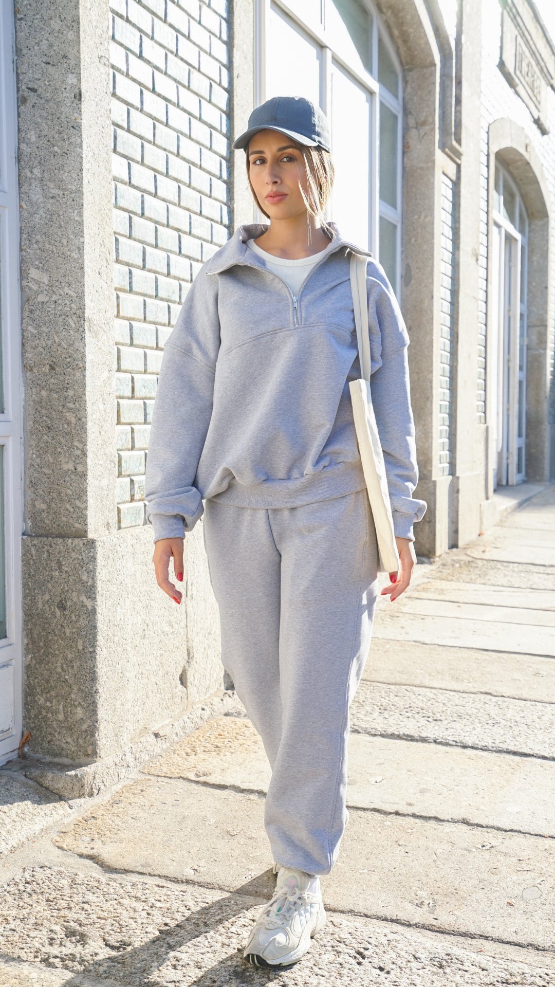 Sweatshirt oversize de gola de lapela e e fecho frontal com zip. Manga comprida com acabamento no punho.